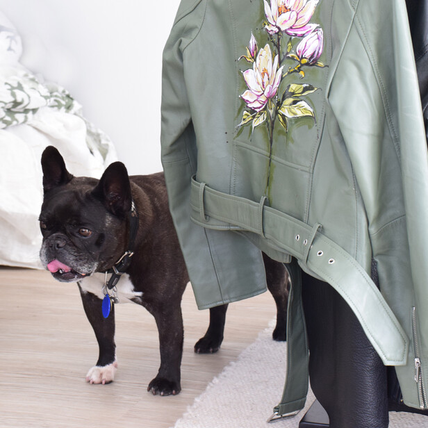 The "Eden" leather jacket is a breathtaking fusion of nature and elegance, crafted from luxurious green-toned leather that evokes the lush beauty of a garden in full bloom. Its centerpiece is a stunning hand-painted magnolia, with delicate petals in soft whites and pinks, gracefully unfolding across the back of the jacket. The green tones of the leather complement the floral design, creating a harmonious blend of vibrant life and sophisticated style. This jacket, named "Eden," captures the essence of renewal and beauty, perfect for those who appreciate artful details and want to carry a piece of nature with them.